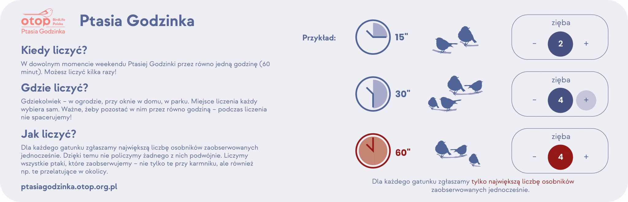 Mimo że liczenie jest bardzo proste i dostępne dla każdego, zawsze powinniśmy przestrzegać kilku podstawowych zasad. Ptasia Godzinka dostarcza bardzo cennych danych o ptakach zimujących. Jeśli metodologia jest prawidłowo zachowana, informacje te mogą służyć także celom naukowym – wspólnie możemy więc odkryć, jak ptakom u nas wiedzie się zimą i jak się zachowują.